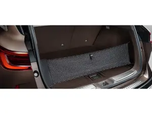 Nylon-cord cargo net with tie-down hooks in the cargo area helps secure loose items and keep them organized.